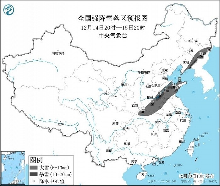 預(yù)計12月13日20時至12月14日20時,內(nèi)蒙古河套地區(qū)、陜西北部和中部以及秦嶺東部、山西南部、湖北西北部、河南中西部、河北中南部、北京西南部、山東北部和西部、遼寧東北部等地部分地區(qū)有大到暴雪,其中,河南西部和陜西秦嶺東部局地有大暴雪或特大暴雪(30~35毫米)。上述部分地區(qū)新增積雪深度5~10厘米,局地可達(dá)18厘米以上。