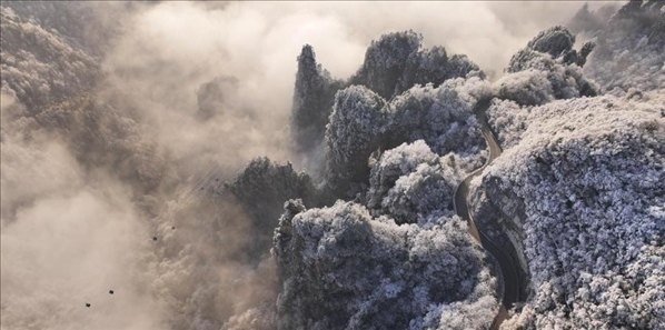 12月19日,湖南張家界國(guó)家森林公園天子山雪后初霽,山巒間銀裝素裹,云霧繚繞,美如畫(huà)卷。