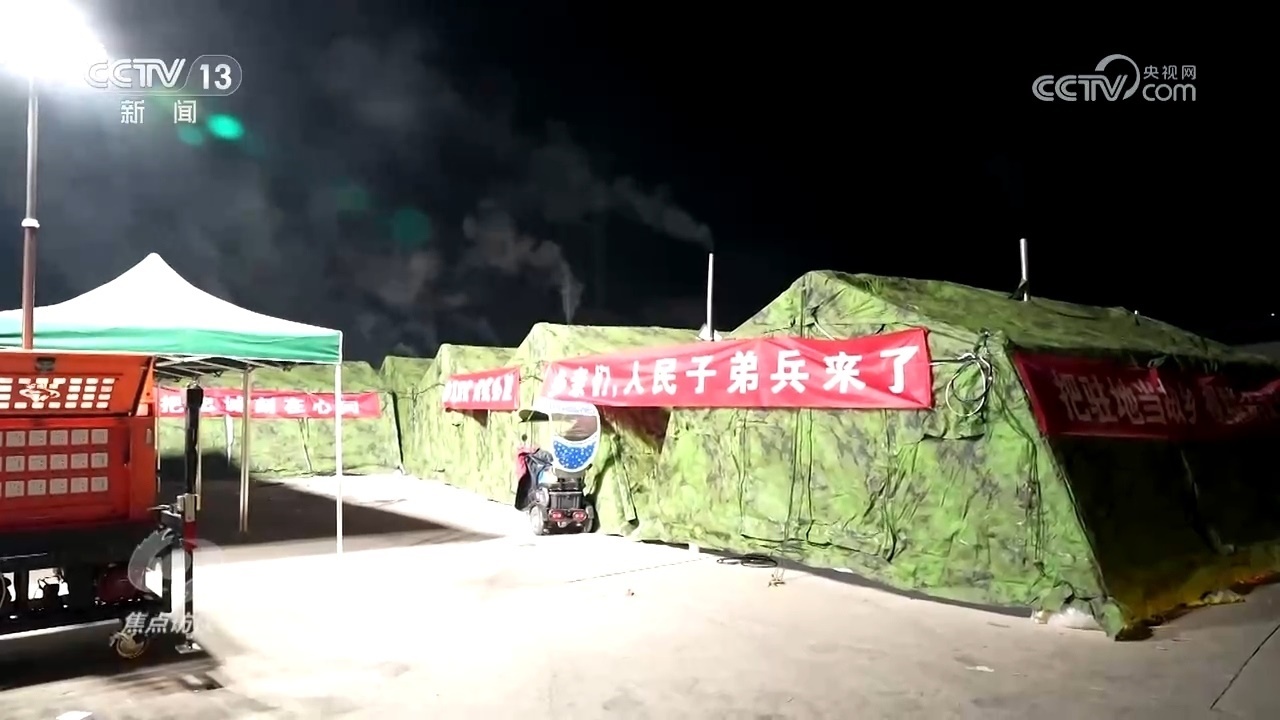 凌晨4時,室外的溫度達(dá)到了零下13℃左右,安置點的每一頂帳篷里面都有一個取暖爐,取暖爐可以保證室內(nèi)的溫度,保證受災(zāi)群眾基本取暖需求。水果、飲料、榨菜、泡面這些基本應(yīng)急物資都有提供,還有一臺炊事車,部隊的炊事車可以提供熱食,像做米飯、饅頭,包括一些炒菜、湯都可以實現(xiàn),可以滿足受災(zāi)群眾的一日三餐,滿足他們的基本用餐需求。