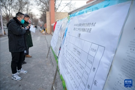 12月23日,考生在寧夏銀川市第二中學(xué)考點外查看考場分布圖。