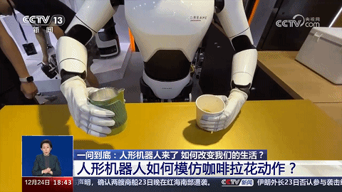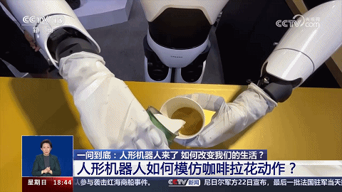 2023年8月,2023世界機(jī)器人大會在北京開幕,現(xiàn)場有個人形機(jī)器人可以模仿“咖啡拉花”動作——開始,把兩個杯子(裝有咖啡、牛奶)遞給人形機(jī)器人;稍后,人形機(jī)器人運(yùn)行AI智能算法,指揮它用“手”完成“咖啡拉花”作業(yè)。