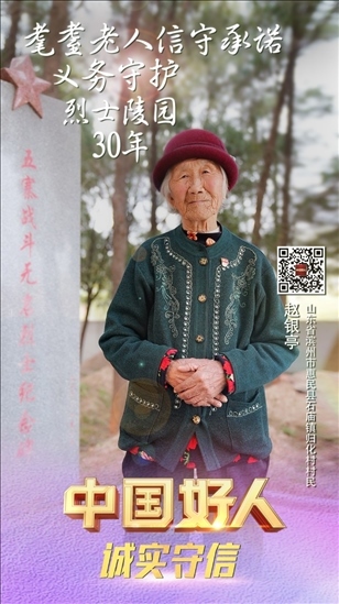 趙銀亭,女,1929年10月生,中共黨員,山東省濱州市惠民縣石廟鎮(zhèn)歸化村村民。趙銀亭是一位有75年黨齡的老黨員。1992年,當?shù)亟⒘沂苛陥@,需要一位守陵人,63歲的趙銀亭主動報了名。自此,她與丈夫搬到了距烈士陵園不過15米的舊屋居住。30多年來,她堅守信仰,守護烈士陵園,為前來參觀的人員講述英烈故事。