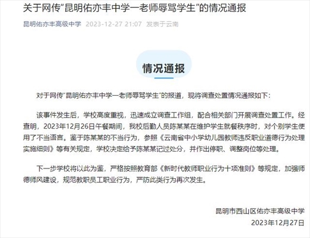 ·昆明某中學(xué)老師辱罵學(xué)生?校方通報(bào):給予記過(guò)、停職、調(diào)整崗位等處理。