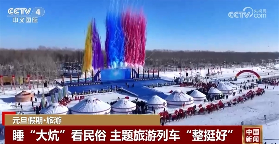 總臺(tái)央視記者 楊曜語(yǔ):我即將登上的列車(chē)就是從哈爾濱開(kāi)往漠河的國(guó)內(nèi)首個(gè)沉浸式東北民俗文化體驗(yàn)列車(chē),坐過(guò)的人都說(shuō)一上車(chē)就想盤(pán)腿兒了,我們趕緊來(lái)體驗(yàn)一下!一上車(chē)我就被濃濃的東北文化所感染到了,整個(gè)車(chē)廂都被東北大花的經(jīng)典配色裝飾著,再加上隨手就能品嘗到東北特色美食,坐在床鋪上就感覺(jué)一秒鐘“穿越”到農(nóng)家炕頭。