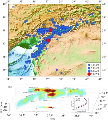 土耳其兩次7.8級(jí)地震及其余震分布(a)和兩次主震的滑動(dòng)位移分布(b)