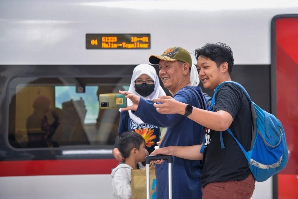 2023年12月25日,乘客在印度尼西亞雅加達(dá)的哈利姆車站站臺與雅萬高鐵高速動車組合影。截至12月24日,作為中印尼共建“一帶一路”合作的“金字招牌”,雅萬高鐵累計(jì)發(fā)送旅客突破100萬人次。