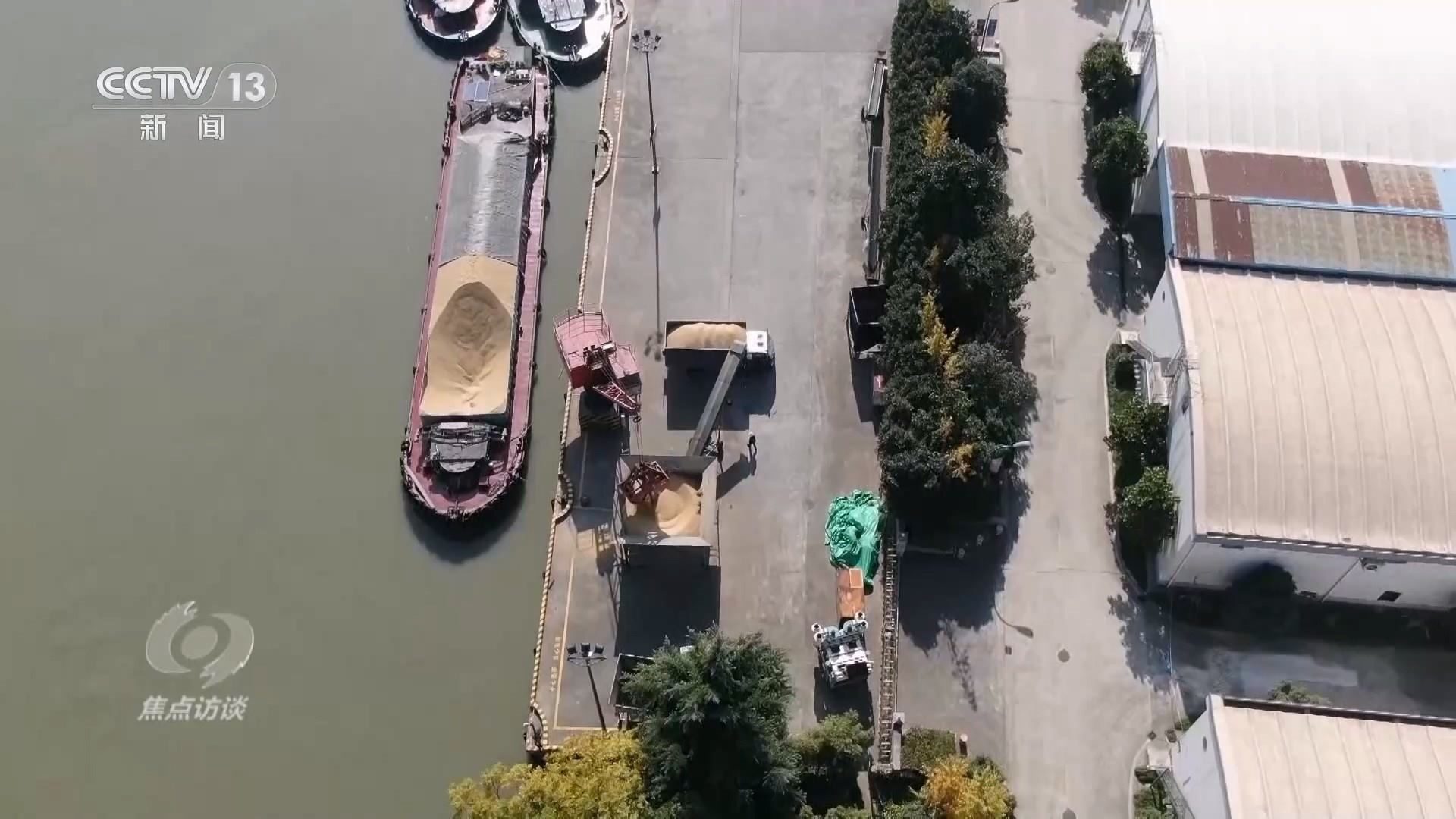 在京杭大運(yùn)河浙江余杭段的這個(gè)碼頭上,貨船上的稻谷正在被轉(zhuǎn)送到貨車(chē)上。碼頭旁是浙江省糧食局直屬糧油儲(chǔ)備庫(kù),稻谷將被儲(chǔ)存在這些倉(cāng)庫(kù)里。