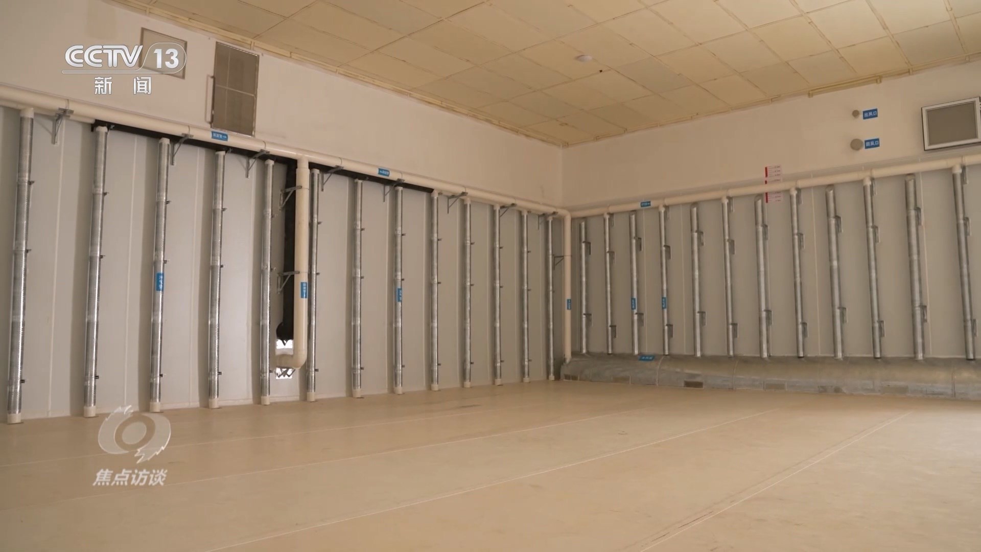 當(dāng)工作人員打開(kāi)這座暫時(shí)空著的倉(cāng)庫(kù)時(shí),墻壁上的一排排管道十分搶眼,天氣熱的時(shí)候,這四面墻的氣道里都會(huì)充入冷空氣,再加上頂部的風(fēng)道,這“五面立體動(dòng)態(tài)控溫技術(shù)”就相當(dāng)于給糧倉(cāng)內(nèi)外加了一道隔離帶,低溫保鮮。