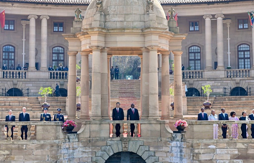 當(dāng)?shù)貢r(shí)間2023年8月22日上午,正在南非進(jìn)行國(guó)事訪(fǎng)問(wèn)的國(guó)家主席習(xí)近平在比勒陀利亞總統(tǒng)府同南非總統(tǒng)拉馬福薩會(huì)談。會(huì)談前,拉馬福薩在總統(tǒng)府廣場(chǎng)為習(xí)近平舉行歡迎儀式。