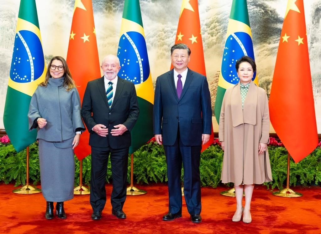 2023年4月14日下午,國(guó)家主席習(xí)近平在北京人民大會(huì)堂同來(lái)華進(jìn)行國(guó)事訪(fǎng)問(wèn)的巴西總統(tǒng)盧拉舉行會(huì)談。這是會(huì)談前,習(xí)近平和夫人彭麗媛同盧拉和夫人羅桑熱拉合影。