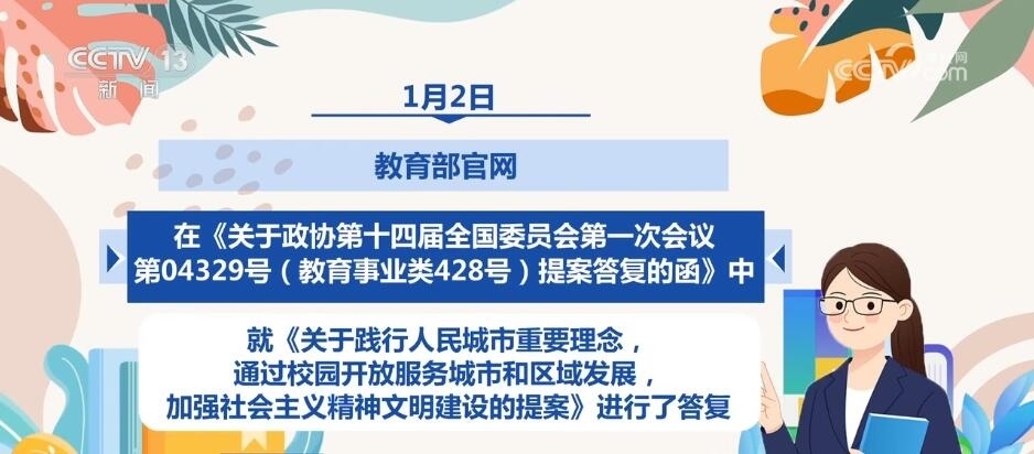 1月2日,教育部官網(wǎng)在《關(guān)于政協(xié)第十四屆全國委員會第一次會議第04329號(教育事業(yè)類428號)提案答復的函》中,就《關(guān)于踐行人民城市重要理念,通過校園開放服務(wù)城市和區(qū)域發(fā)展,加強社會主義精神文明建設(shè)的提案》進行了答復。
