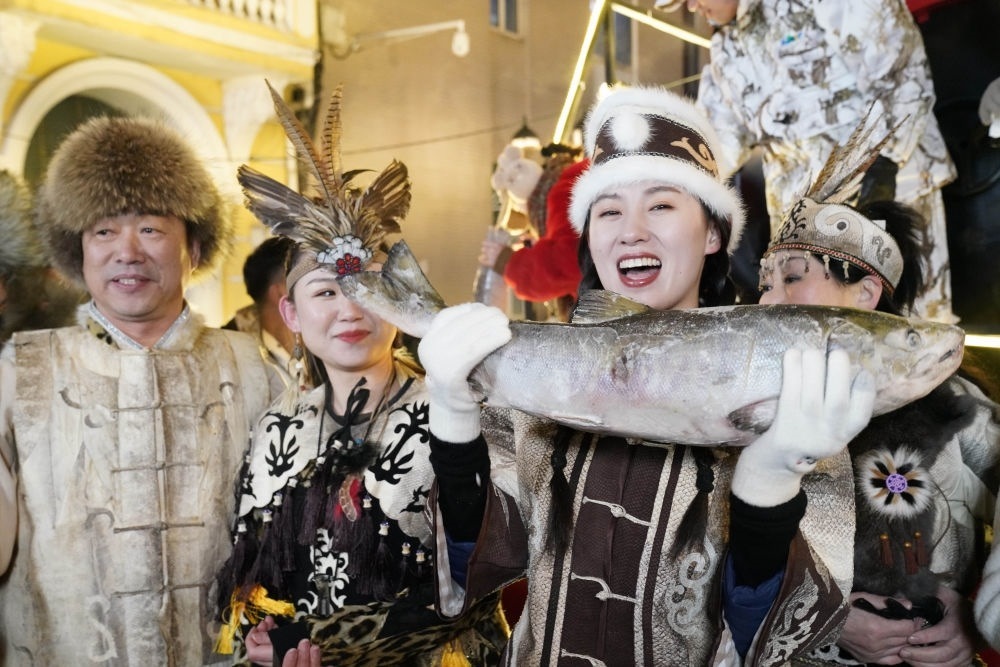 ↑1月6日,身著赫哲族服飾的饒河縣文旅推薦官在哈爾濱中央大街上推介家鄉(xiāng)特產(chǎn)魚品。
