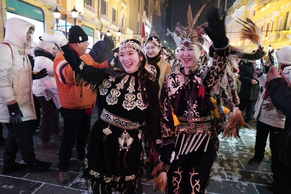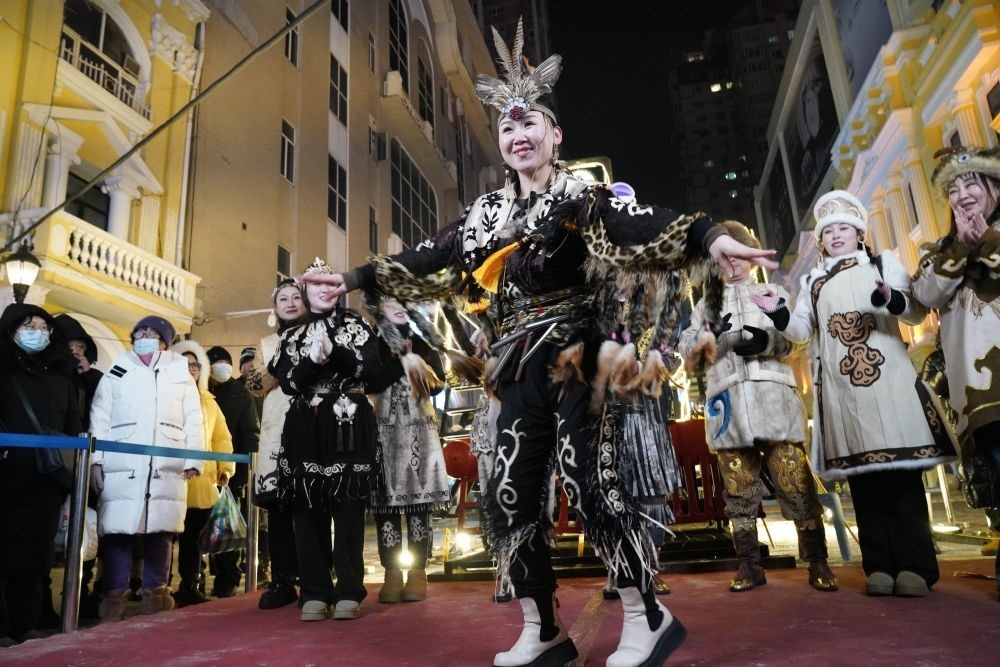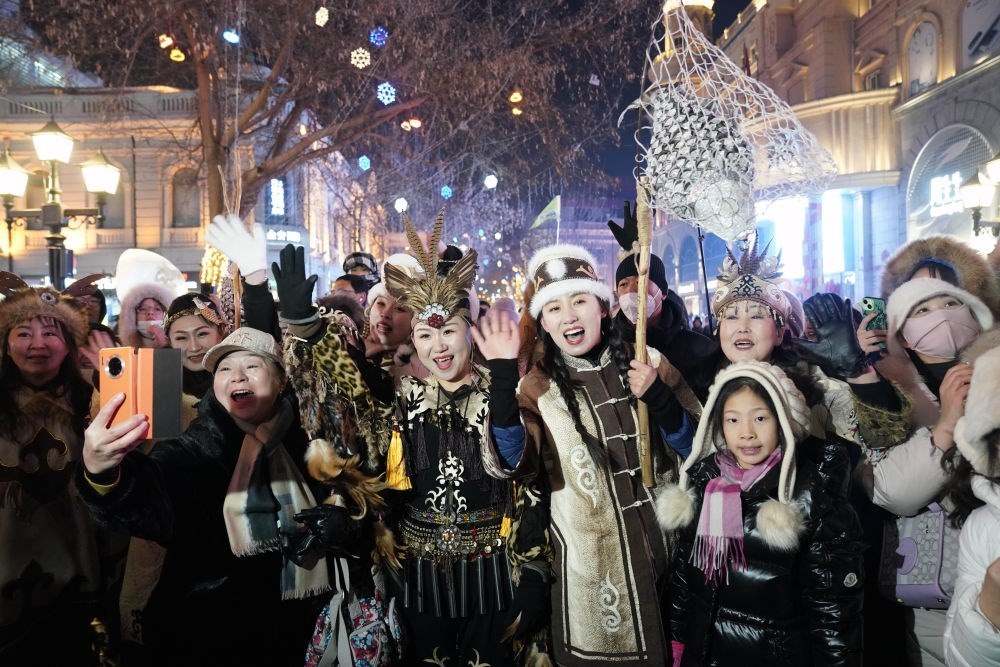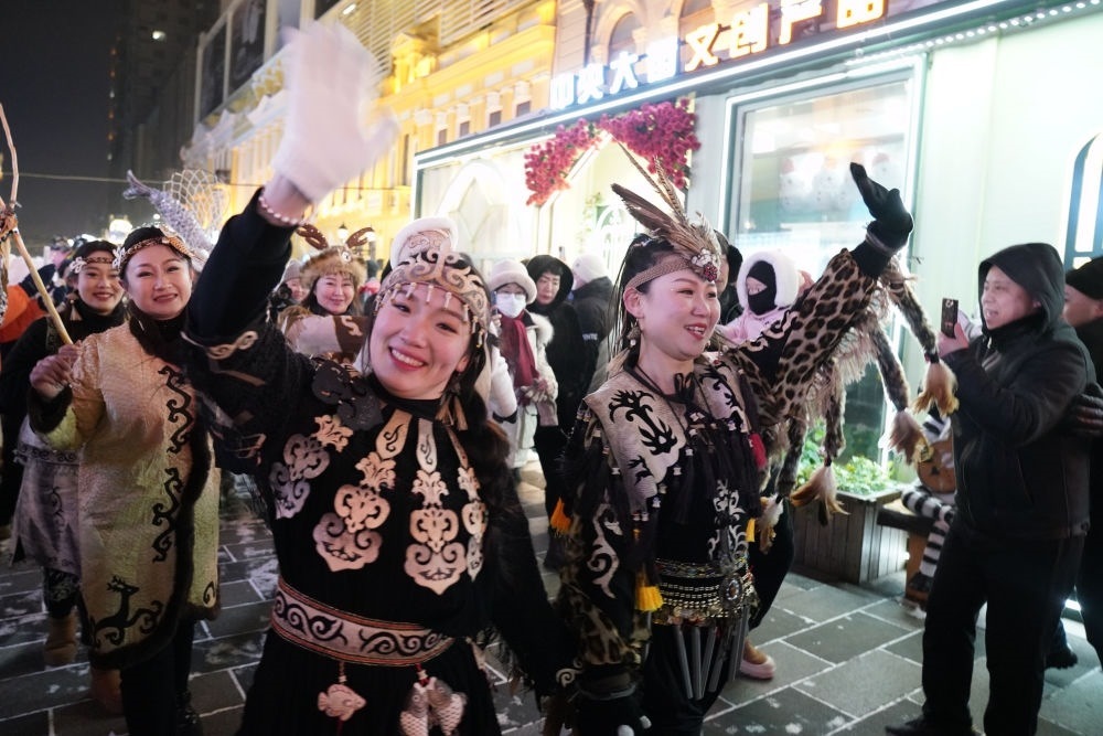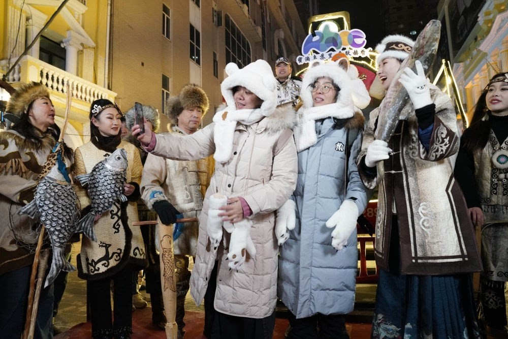 ↑1月6日,身著赫哲族服飾的赫哲族群眾在哈爾濱中央大街上與游客互動。