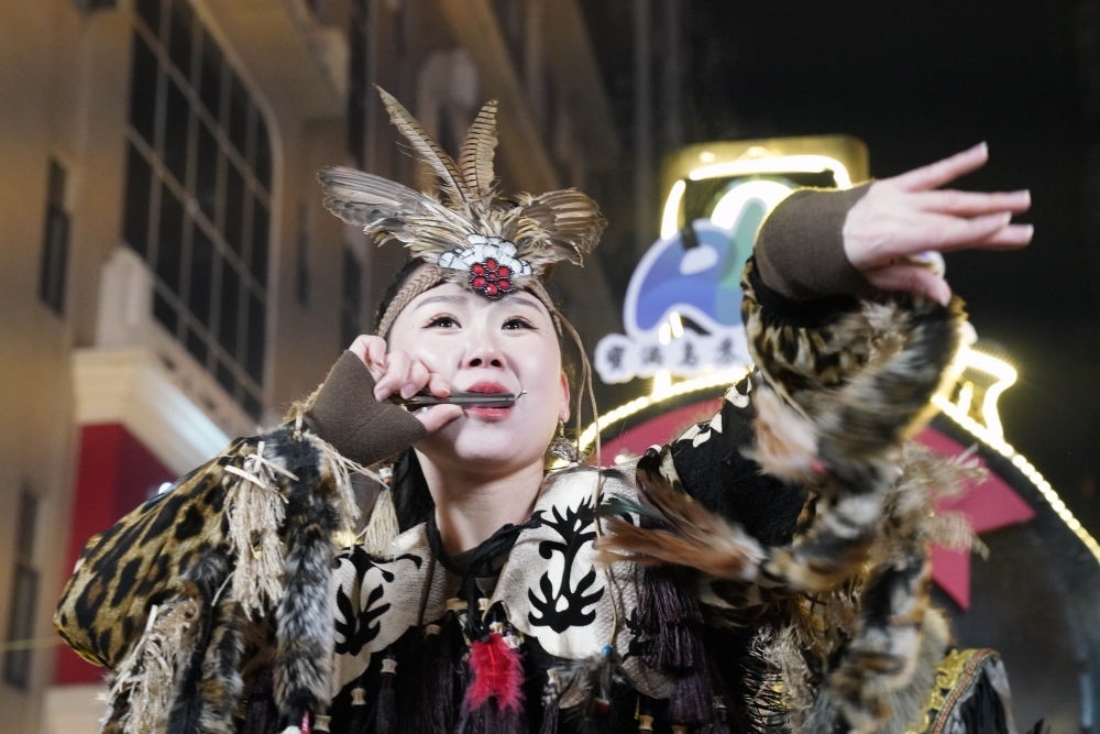 ↑1月6日,戴著魚皮頭飾的赫哲族姑娘在哈爾濱中央大街上參與家鄉(xiāng)推介活動。