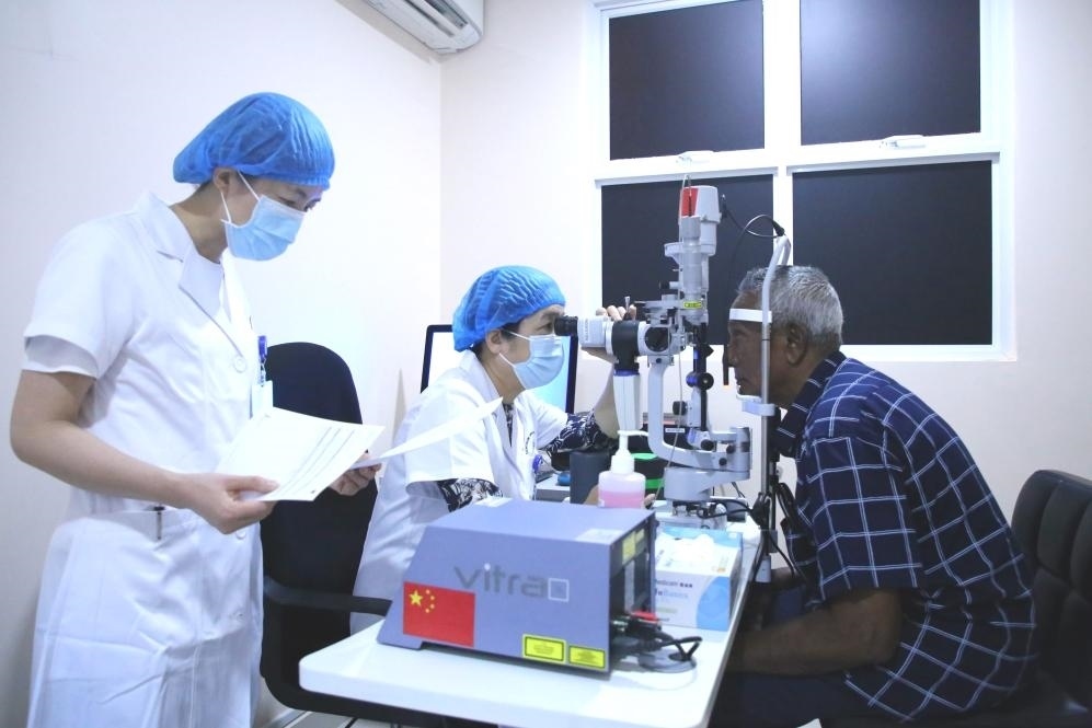 2023年2月4日,在馬爾代夫首都馬累附近的胡魯馬累醫(yī)院,中國-馬爾代夫眼科中心中方專家為當?shù)鼗颊咦鲅劭茩z查。