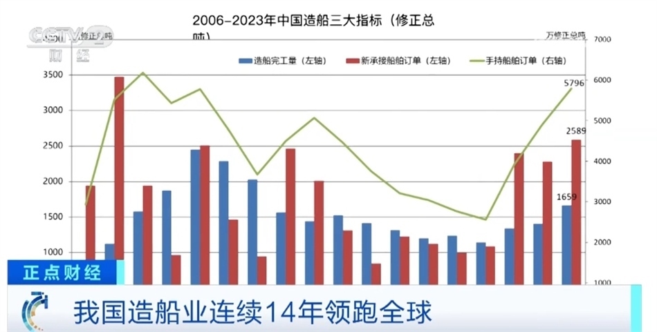 總臺央視記者 吳天白:在2023年中國造船業(yè)統(tǒng)計(jì)數(shù)據(jù)中,我們還可以看到三大指標(biāo)占國際市場份額分別是50.2%、66.6%和55.0%,首次全部超過50%。從這幾張數(shù)據(jù)圖中,我們可以看出,我國高技術(shù)、高價(jià)值船型的新接訂單量創(chuàng)2008年以來新高,在這里我們可以看到中國新接綠色動力船舶訂單占國際市場的份額也是連年增長,2023年全年已經(jīng)達(dá)到了57%。這也表明了未來全球一半以上的新能源船都將產(chǎn)自中國。