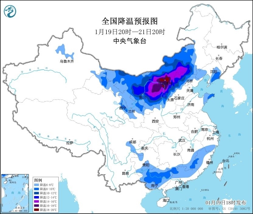 預(yù)計,1月19日20時至1月21日20時,西北地區(qū)東部、內(nèi)蒙古中西部、華北北部、華南等地的部分地區(qū)將降溫8~12℃,其中,內(nèi)蒙古河套地區(qū)和中部、陜西北部、山西北部、河北西北部等地部分地區(qū)降溫可達14~16℃,局地可超過18℃。