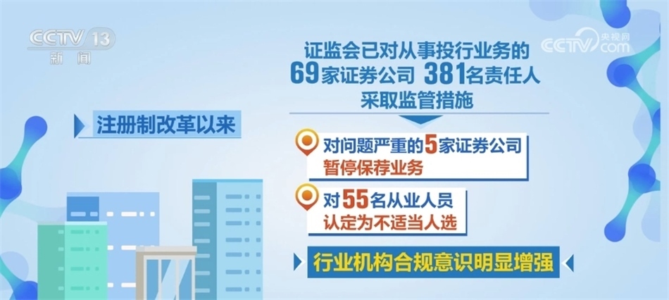 數(shù)據(jù)顯示,注冊(cè)制改革以來(lái),證監(jiān)會(huì)已對(duì)從事投行業(yè)務(wù)的69家證券公司、381名責(zé)任人采取了監(jiān)管措施,特別是對(duì)問(wèn)題嚴(yán)重的5家證券公司暫停保薦業(yè)務(wù),對(duì)55名從業(yè)人員認(rèn)定為不適當(dāng)人選,行業(yè)機(jī)構(gòu)合規(guī)意識(shí)明顯增強(qiáng)。