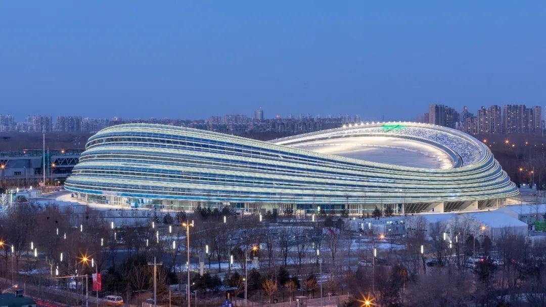 沿北京中軸線一路向北,空中俯瞰,國家速滑館宛若冰刀在冰面上刻下的晶瑩軌跡。它的另一個(gè)名稱“冰絲帶”,由此得名。