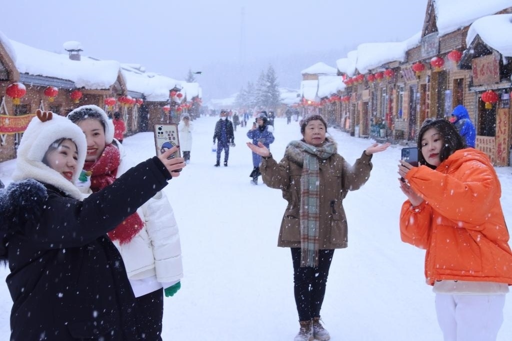 在黑龍江大海林林業(yè)局有限公司雙峰林場,游客在街頭游覽拍照。新華社發(fā)(張春祥攝)