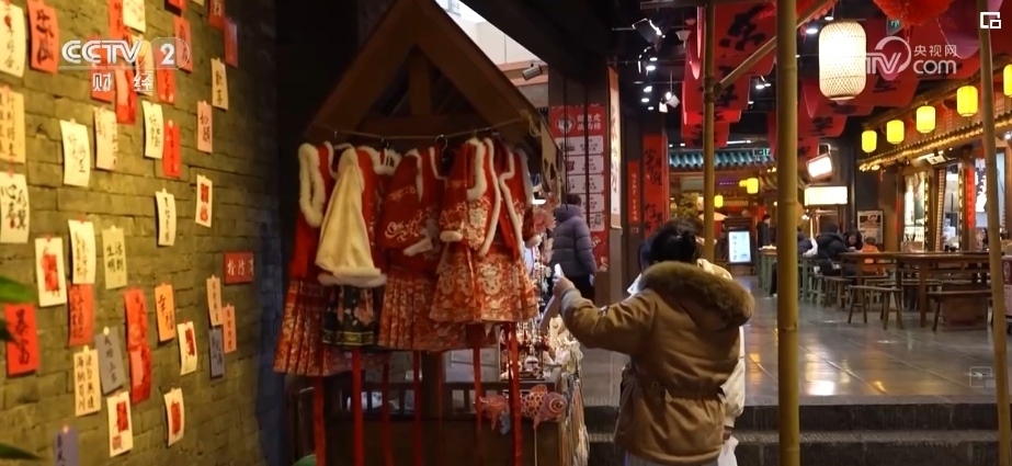 在中國(guó)人的習(xí)俗中,過年少不了趕集。長(zhǎng)沙在宋朝時(shí)被稱作潭州,是重要的商業(yè)中心之一。在宋風(fēng)市井文化體驗(yàn)地潭州市集,春聯(lián)、龍燈等裝飾,吸引了不少游客。