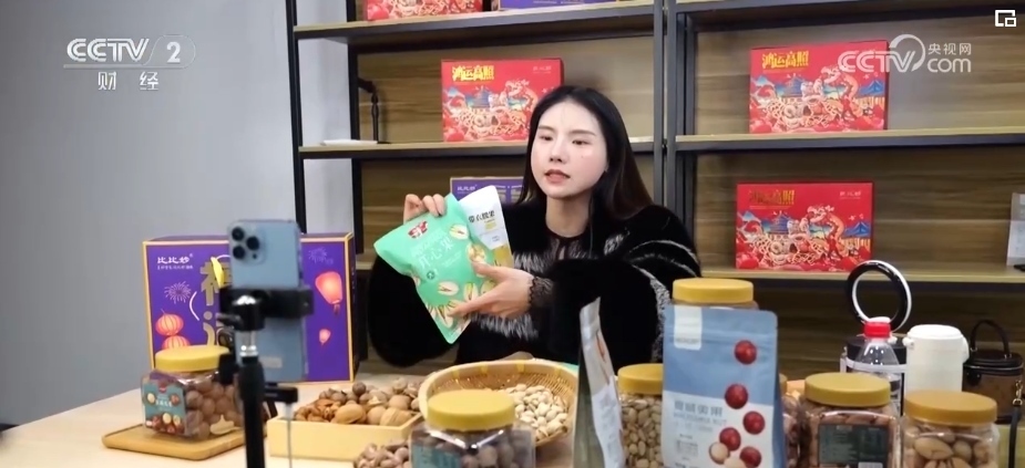 零食的線上銷售同樣增長明顯。在浙江臨安的一個直播基地內,主播們正輪番上陣推薦品類不一的堅果零食。