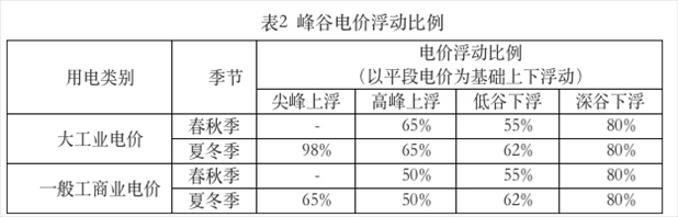 (三)調(diào)整峰谷電價浮動比例,具體見表2。浮動比例以平段電價為基礎,平段電價包含上網(wǎng)電價、上網(wǎng)環(huán)節(jié)線損費用、系統(tǒng)運行費用、輸配電價(不含容(需)電價)、政府性基金及附加。