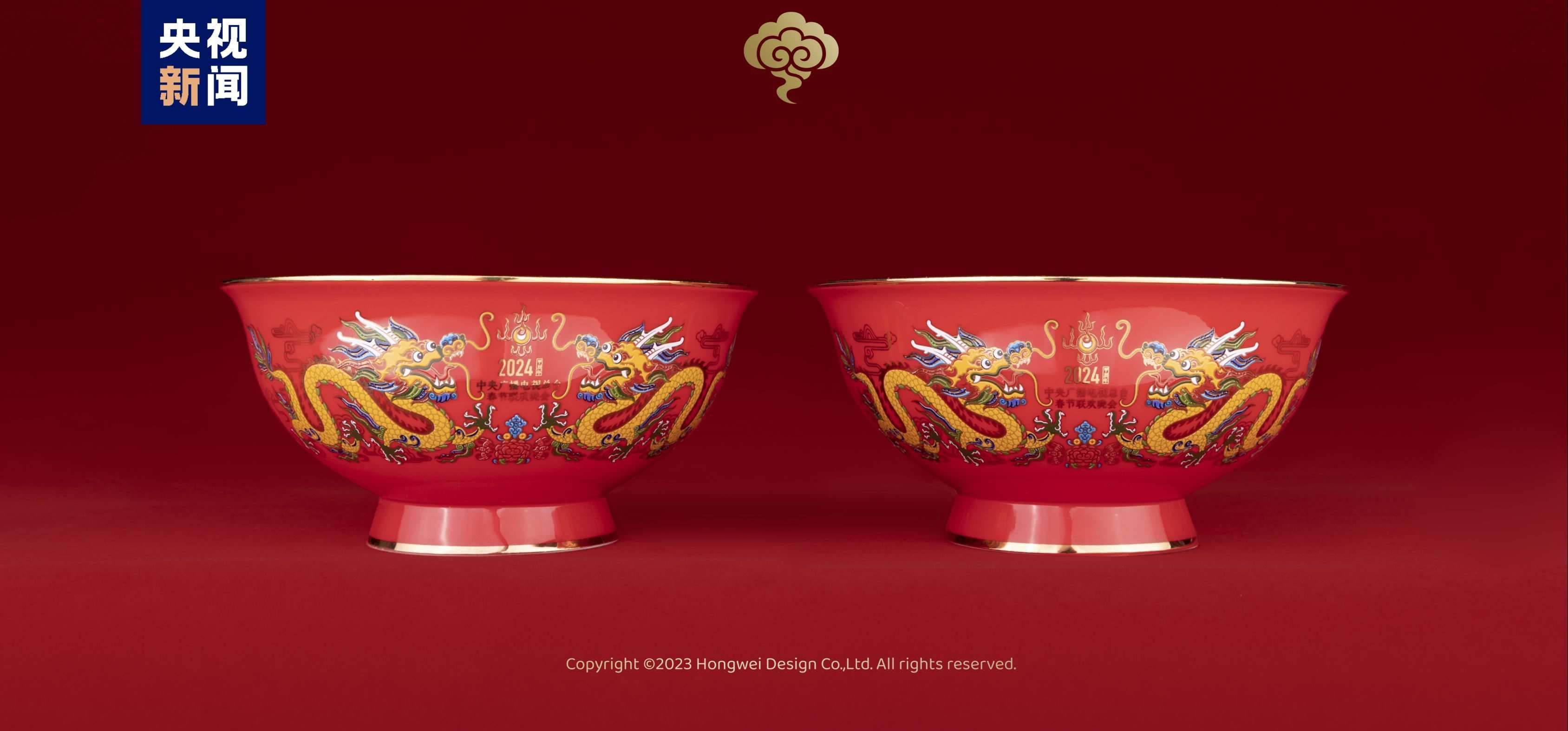 總臺文創(chuàng)的龍碗主畫面取自中國民間吉祥裝飾圖案“雙龍戲珠”,采用對稱型構(gòu)圖,寓意富貴吉祥,幸福安康。龍碗色彩鮮艷明快,烘托出民間新年的喜慶氛圍。