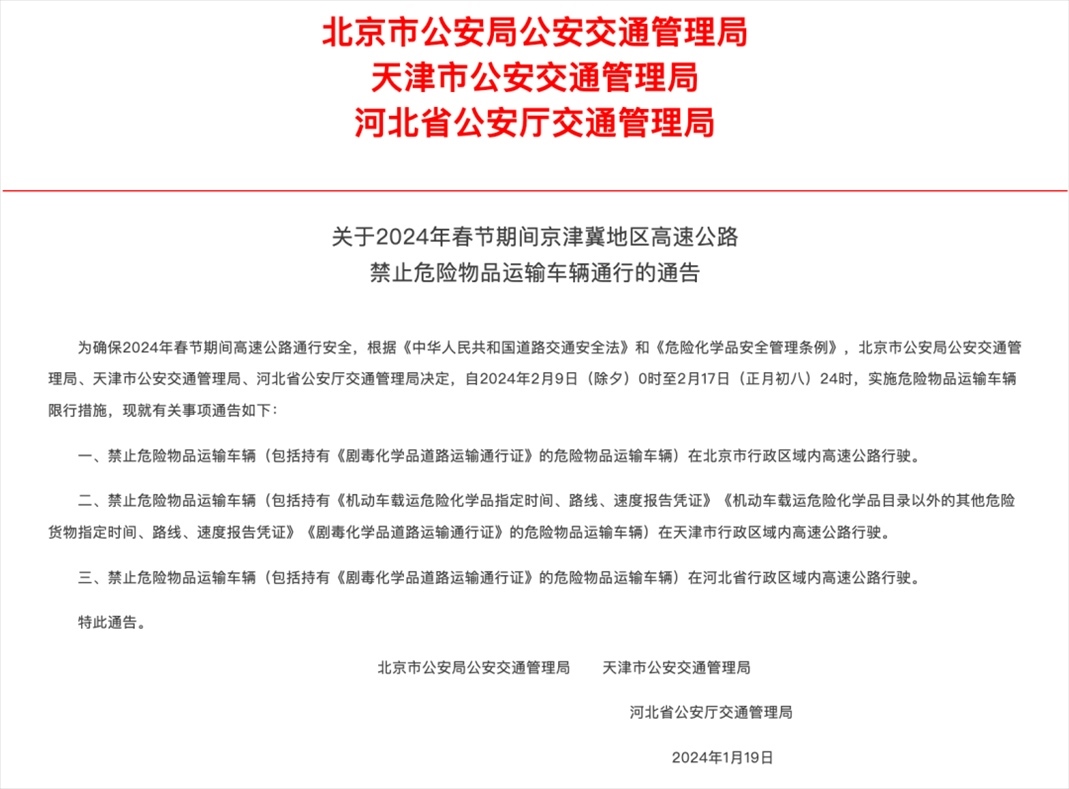 北京市公安局公安交通管理局、天津市公安交通管理局、河北省公安廳交通管理局決定,自2024年2月9日(除夕)0時(shí)至2月17日(正月初八)24時(shí),實(shí)施危險(xiǎn)物品運(yùn)輸車(chē)輛限行措施,現(xiàn)就有關(guān)事項(xiàng)通告如下: