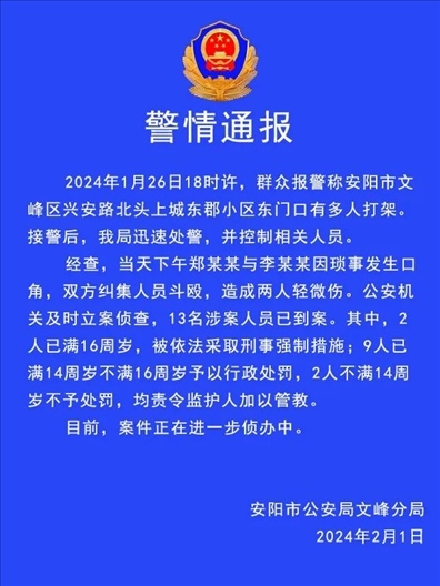 ·河南安陽警方通報一起斗毆案:2人因瑣事爭執(zhí)糾集多人斗毆,13人已到案,其中11人不滿16歲。