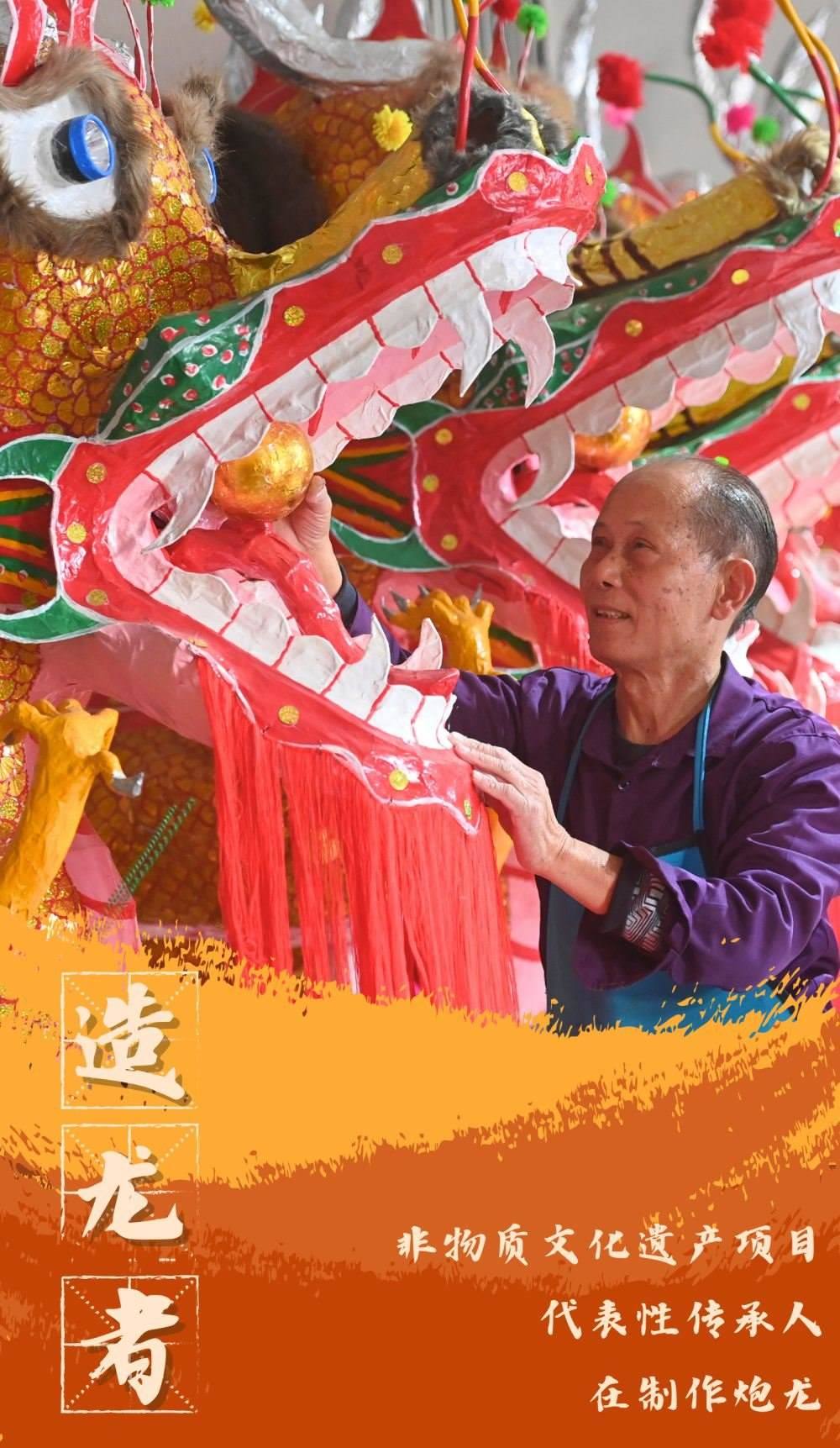 用竹篾扎制龍頭、龍尾,用砂紙裝裱,麻繩串聯(lián)龍身,用龍布裝飾,僅龍頭就有1000多個(gè)捆綁點(diǎn),一條炮龍需多人合制半個(gè)月才能完成……造龍,需要非凡的耐心和超群的手藝。