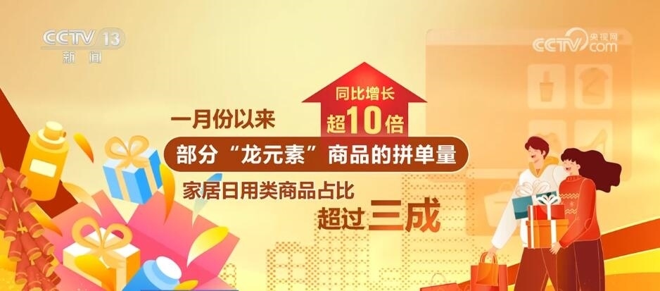 “龍?jiān)亍碑?dāng)仁不讓地成為今年春節(jié)的新“頂流”,不光有龍年的福字對聯(lián),還有龍年臺(tái)歷、龍寶寶毛絨玩具、龍年紅色內(nèi)衣、龍年中國結(jié)掛飾成為最熱銷的春節(jié)周邊商品前五名。1月份以來,部分“龍?jiān)亍鄙唐返钠磫瘟客仍鲩L超10倍,其中,家居日用類商品占比超過三成。