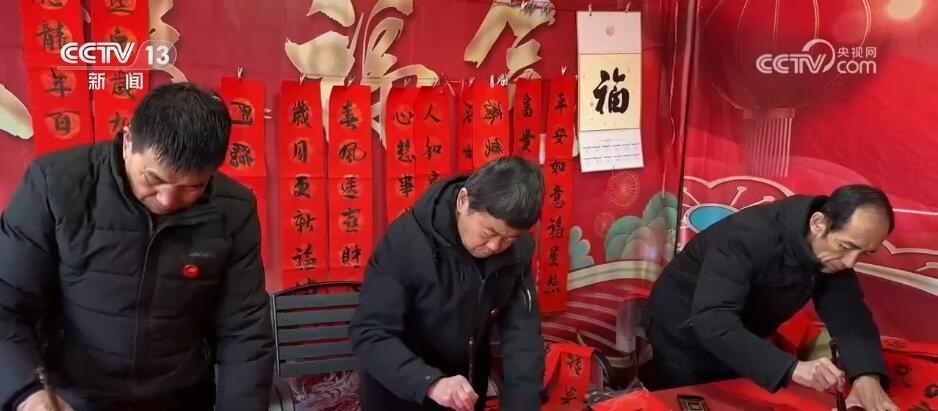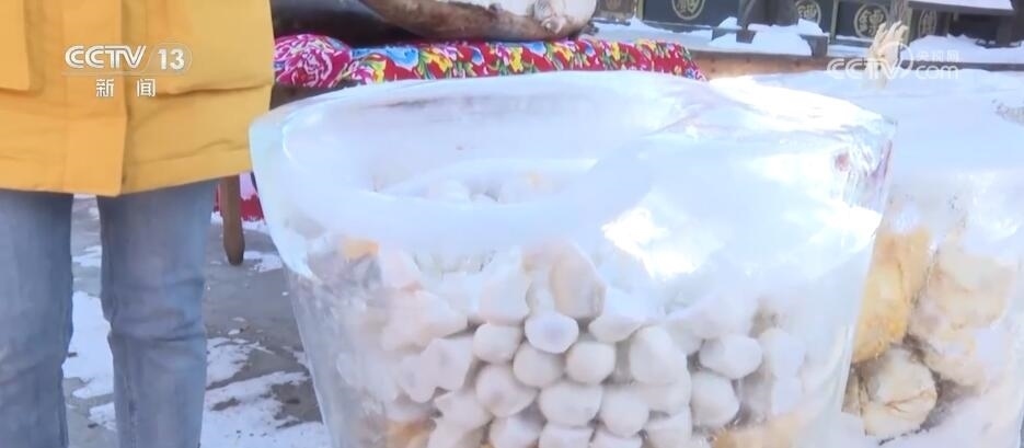 不僅是商品非常有特色,大家來(lái)看,這個(gè)裝粘豆包的大缸非常結(jié)實(shí),晶瑩剔透。它是用水桶為模具,內(nèi)部裝水,在室外凍上一個(gè)晚上,脫模后就成了一個(gè)天然冰箱,在鄉(xiāng)村,各家年貨、凍貨都可以?xún)?chǔ)存在這里,整個(gè)冬天都沒(méi)有問(wèn)題,既保鮮又節(jié)約空間。大集上,還有對(duì)聯(lián)、福字、鄉(xiāng)村土特產(chǎn),充滿(mǎn)濃濃的鄉(xiāng)土氣息。