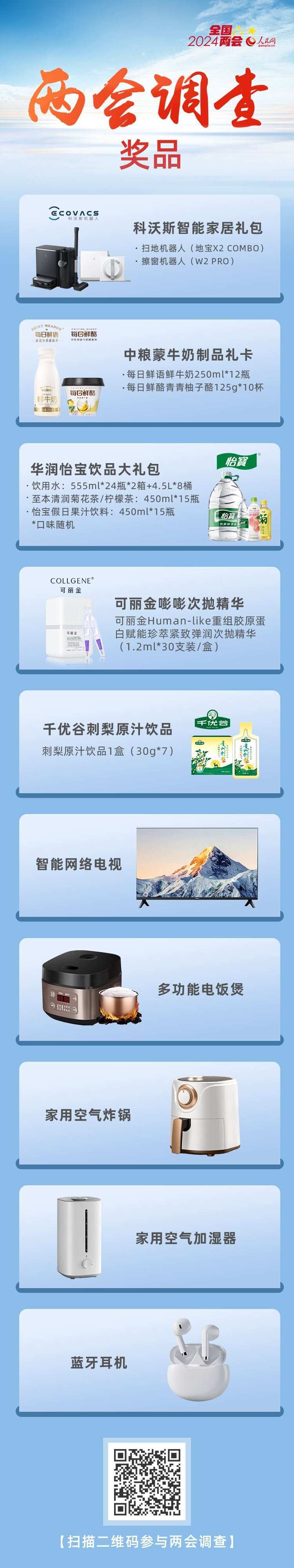 為感謝網(wǎng)友對(duì)全國兩會(huì)調(diào)查的支持,參與人民網(wǎng)2024年全國兩會(huì)調(diào)查還有機(jī)會(huì)抽取精美獎(jiǎng)品。