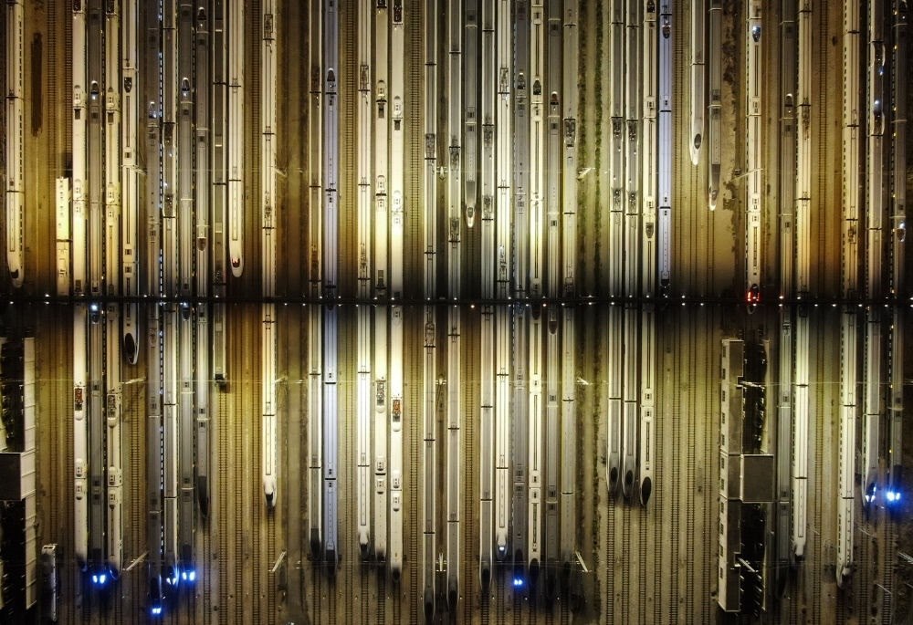 2024年1月26日凌晨,動(dòng)車組列車停靠在廣州動(dòng)車段的存車線上(無人機(jī)照片)。新華社記者 鄧華 攝