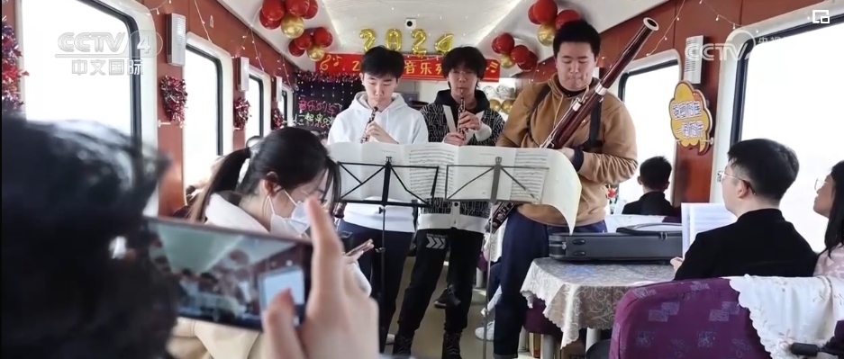 隨著春節(jié)臨近,在外務(wù)工的游子們紛紛踏上了回家的旅途。在青島北開往成都西Z318次列車上,悅耳歡快旋律響起,列車工作人員邀請(qǐng)3位學(xué)生旅客,為大家演奏了悠揚(yáng)歡快的樂(lè)曲。