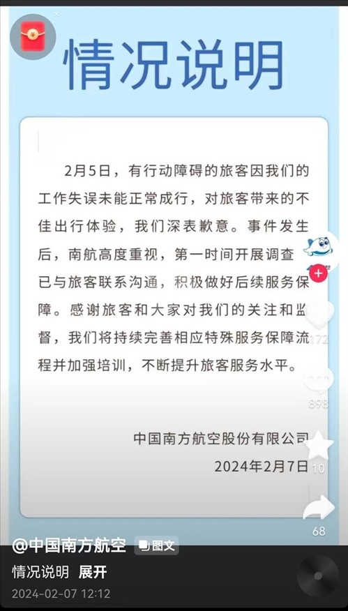 ·網(wǎng)友稱成功申請坐輪椅獨(dú)飛后遭拒載,南航道歉:工作失誤致旅客未能正常成行。