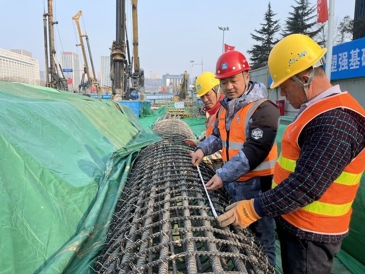 2024年2月9日,在中建八局承建的濟(jì)南軌道交通7號(hào)線(xiàn)一期工程的龍奧大廈站施工現(xiàn)場(chǎng),質(zhì)量工程師劉學(xué)(中)在檢查鋼筋籠焊接質(zhì)量。新華社發(fā)
