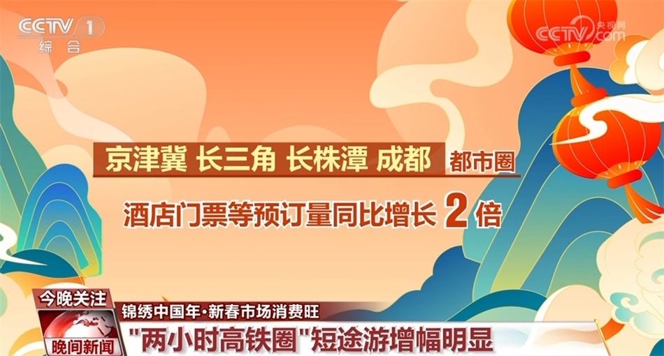 而在說走就走的短途游中,“兩小時高鐵圈”受到青睞。截至大年初一,春節(jié)假期“兩小時高鐵圈”短途游的搜索量同比增長7倍。從實際預(yù)訂情況看,京津冀、長三角、長株潭、成都都市圈等區(qū)域的酒店、門票等相關(guān)旅游產(chǎn)品預(yù)訂量同比增長2倍。
