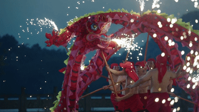 生龍活現(xiàn)(放煙花):登場的兩條龍,點(diǎn)燃提前放置的焰火筒,在龍珠的帶領(lǐng)下,形成“口中火”“脊上火”“腹中火”“導(dǎo)引火”的立體方陣,熱烈多彩。