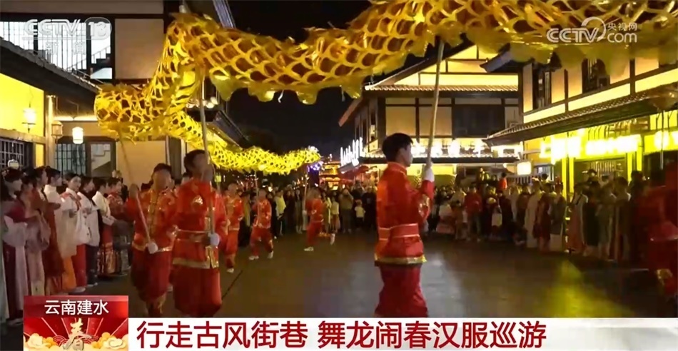 在云南紅河州建水縣紫陶里漢唐街區(qū),一場舞龍鬧春漢服巡游活動拉開了序幕。舞龍隊伍一路閃轉(zhuǎn)騰挪,一條黃色長龍奮力舞動,忽高忽低,飄忽飛逸。身著華美漢服的姑娘行走在古風(fēng)街巷間,一種古樸幽遠(yuǎn)的韻味撲面而來。市民與游客在感受建水年味的同時,也體驗(yàn)到中華傳統(tǒng)文化之美。
