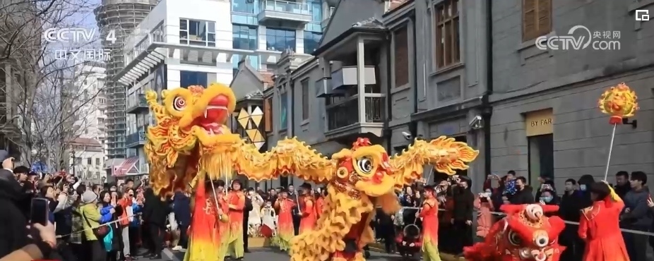 在上海的大街小巷,舞龍舞獅、光影秀等各類新春活動(dòng)陸續(xù)登場,讓市民游客感受龍年的歡騰圖景。一大早,隨著鑼鼓聲激昂開場,一條金龍和兩頭活潑的醒獅在上海市茂名北路威武亮相。龍獅團(tuán)成員們舞動(dòng)一條長約30米的巨龍?jiān)诮质猩洗┧笥巫撸瞬簧偈忻裼慰婉v足觀看。