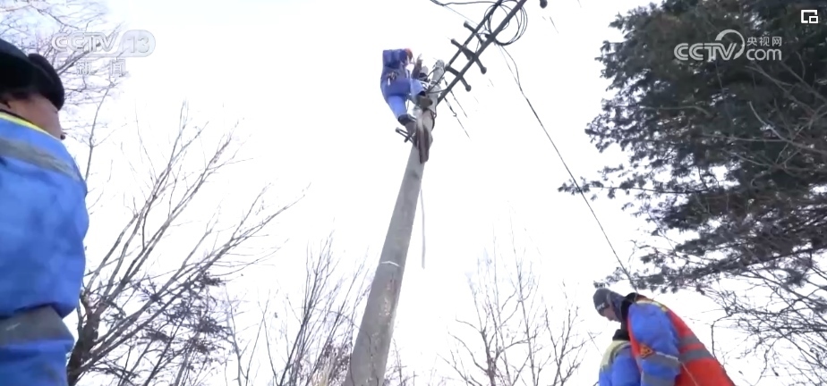 工友們處理完樹倒后,兩位老師傅又趕緊系上安全帶穿上腳扣又爬上通信電桿排查隱患。