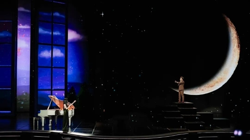 歌詞迅速修改到位,但舞臺(tái)的呈現(xiàn)成了讓人反復(fù)琢磨的問題。如何表現(xiàn)“想見卻無法相見”的感覺?如何營(yíng)造恰到好處的絲絲愁緒?從初次彩排時(shí)用秋千承載思念,到二排時(shí)改用燈光打造“兩個(gè)空間”,幾番嘗試總讓人感覺“還差點(diǎn)兒味道”。最后臺(tái)長(zhǎng)提議,用“剪影”去暈染思念的情緒,可以考慮用蘇軾的“人有悲歡離合,月有陰晴圓缺”的意境,以月亮為背景。這一下子打開了大家的思路。