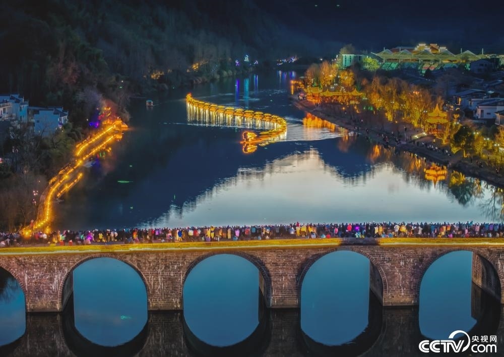 2024年2月12日,安徽黃山齊云山景區(qū),一條由幾十艘竹筏組成百米“金色巨龍”在橫江江面上游弋而過(guò),構(gòu)成一幅震撼的金龍巡游畫(huà)卷。