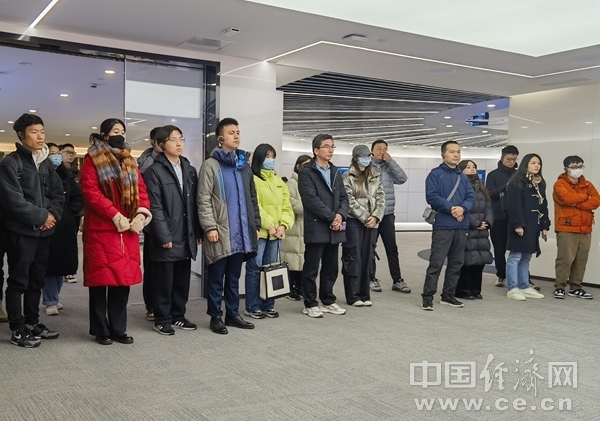 2023年12月18日,浙江大學(xué)師生代表隨團(tuán)在浙江杭州中國視谷調(diào)研。左二為浙江大學(xué)學(xué)生蔡安禧,左三為浙江大學(xué)學(xué)生金姚烗,左四為浙江大學(xué)馬克思主義學(xué)院教師陳曉偉。(中國經(jīng)濟(jì)網(wǎng)記者 王巖/攝)