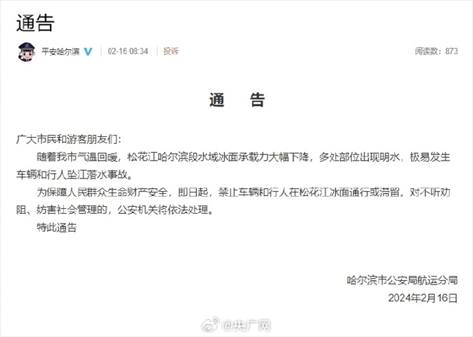 ·哈爾濱市公安局航運(yùn)分局提醒:松花江冰面禁止車輛和行人通行。