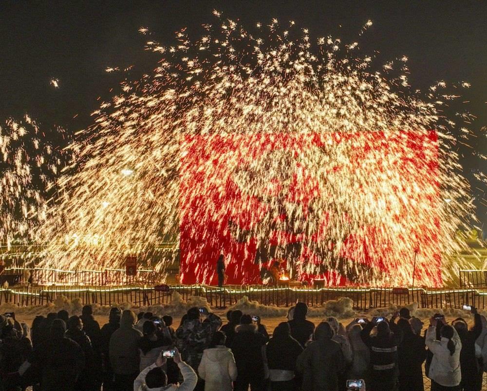 2024年2月10日,游客在河北省遵化市團(tuán)瓢莊鎮(zhèn)山里各莊景區(qū)觀看打鐵花表演。新華社發(fā)(劉滿倉(cāng) 攝)