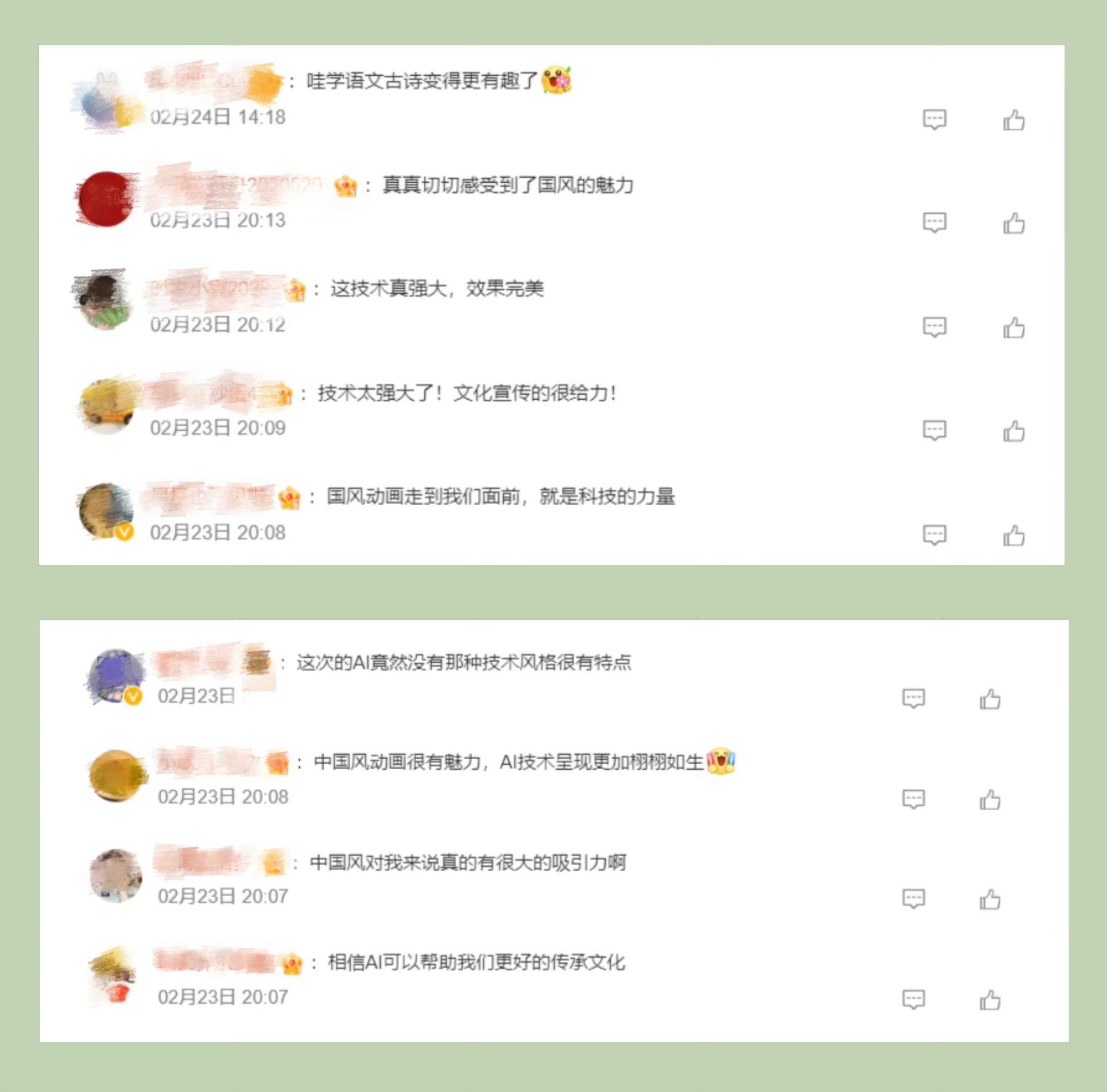 節(jié)目探索詩畫融通的國風(fēng)動畫片新呈現(xiàn),讓廣大青少年進一步加深了對中國經(jīng)典詩詞的理解和喜愛?!癆I”“總臺”“千秋詩頌”等成為網(wǎng)友熱議高頻詞。截至2月27日20:00,話題#千秋詩頌#閱讀量超791萬次。網(wǎng)友紛紛留言:“看到這個系列片,我真的深深感受到了中國傳統(tǒng)文化的深厚底蘊。這些古詩詞深入骨髓,流淌在我們的血液中,是我們國家的文化符號”“以AI為媒,央視制作的這部國風(fēng)動畫片傳承了經(jīng)典,喚醒了古韻的新生命”“唯美的畫面讓人動容,用視覺的形式了解《別董大》這一首古老的詩歌更別有一番韻味”“這種科技與動畫片的結(jié)合,恰好是現(xiàn)在小朋友們和大朋友們所需要的”。