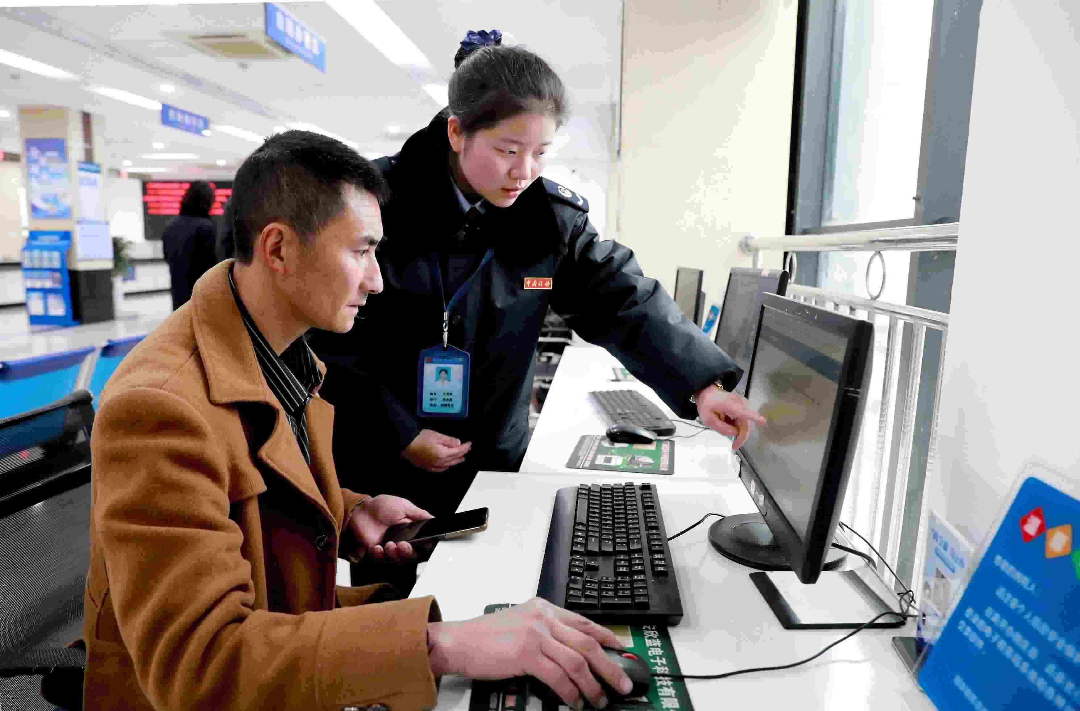 △ 2023年12月12日,四川省華鎣市政務(wù)服務(wù)大廳,稅務(wù)局流動(dòng)崗位工作人員向群眾介紹網(wǎng)上自助辦理稅務(wù)事項(xiàng)。